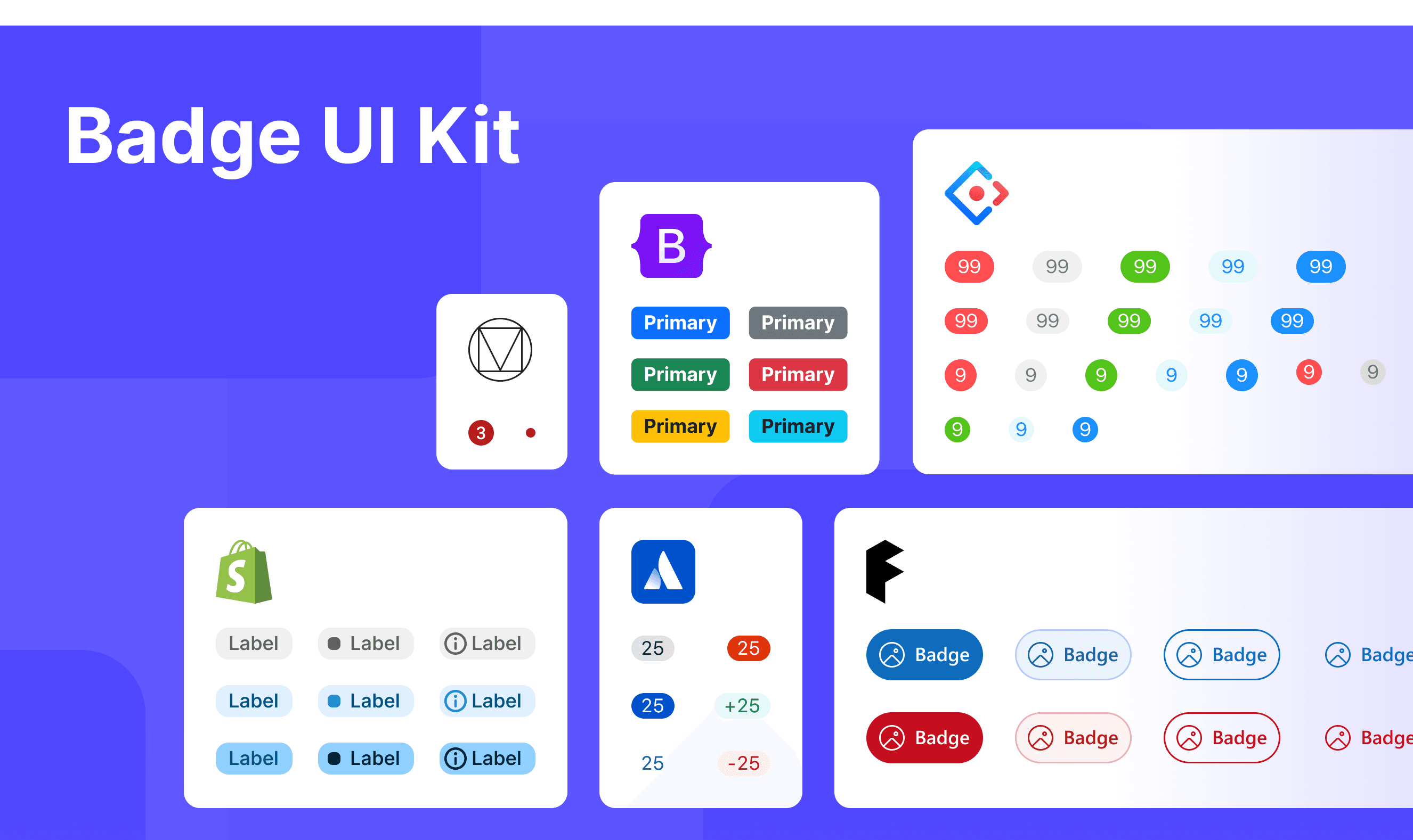 This UIkit file combines badge designs from Material, Atlassian, Fluent 2, Ant, Polaris and Bootstrap Design System. It showcases their styles, usage, and customization in one place for easy exploration and selection.